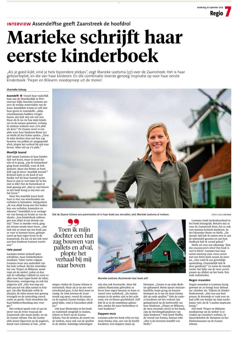 Er is een groot artikel over mijn kinderboek 'Pieper en Bliksem - Noodoproep uit de molen' in het Noordhollands Dagblad verschenen! Wat een eer om zo'n mooie plek te krijgen om mijn verhaal te vertellen.